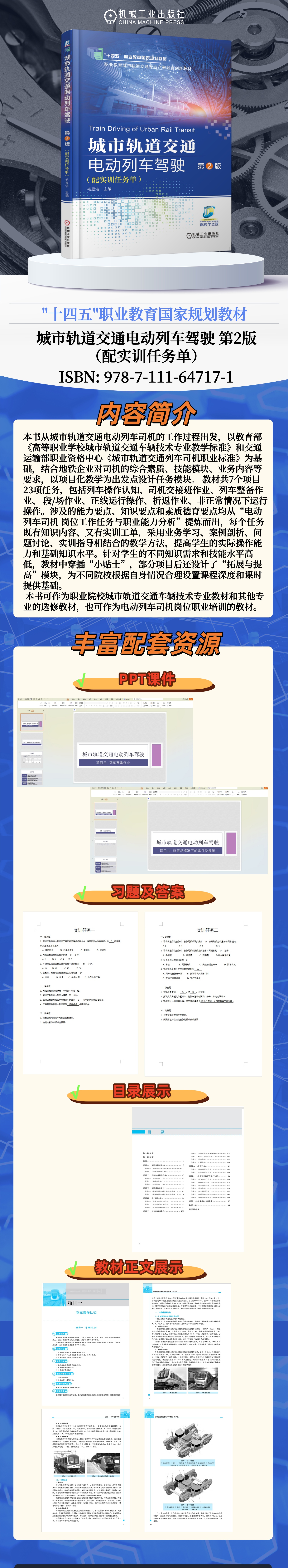 本书从城市轨道交通电动列车司机的工作过程出发,以教育部《高等职业学校城市轨道交通车辆技术专业教学标准》和交通运输部职业资格中心《城市轨道交通列车司机职业标准》为基础,结合地铁企业对司机的综合素质、技能模块、业务内容等要求,以项目化教学为出发点设计任务模块。 教材共7个项目23项任务,包括列车操作认知、司机交接班作业、列车整备作业、 段/场作业、正线运行操作、折返作业、非正常情况下运行操作。涉及的能力要点、知识要点和素质德育要点均从“电动列车司机 岗位工作任务与职业能力分析”提炼而出,每个任务既有知识内容、又有实训工单,采用业务学习、案例剖析、问题讨论、实训指导相结合的教学方法,提高学生的实际操作能力和基础知识水平。针对学生的不同知识需求和技能水平高低,教材中穿插“小贴士”,部分项目后还设计了“拓展与提高”模块,为不同院校根据自身情况合理设置课程深度和课时提供基础。 本书可作为职业院校城市轨道交通车辆技术专业教材和其他专业的选修教材,也可作为电动列车司机岗位职业培训的教材。