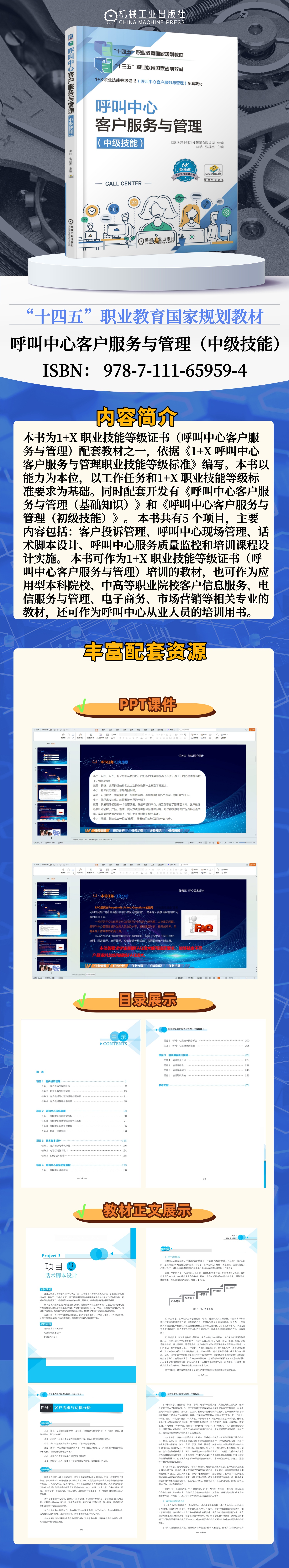 本书为1+X 职业技能等级证书(呼叫中心客户服务与管理)配套教材之一,依据《1+X 呼叫中心客户服务与管理职业技能等级标准》编写。本书以能力为本位,以工作任务和1+X 职业技能等级标准要求为基础。同时配套开发有《呼叫中心客户服务与管理(基础知识)》和《呼叫中心客户服务与管理(初级技能)》。 本书共有5 个项目,主要内容包括:客户投诉管理、呼叫中心现场管理、话术脚本设计、呼叫中心服务质量监控和培训课程设计实施。 本书可作为1+X 职业技能等级证书(呼叫中心客户服务与管理)培训的教材,也可作为应用型本科院校、中高等职业院校客户信息服务、电信服务与管理、电子商务、市场营销等相关专业的教材,还可作为呼叫中心从业人员的培训用书。