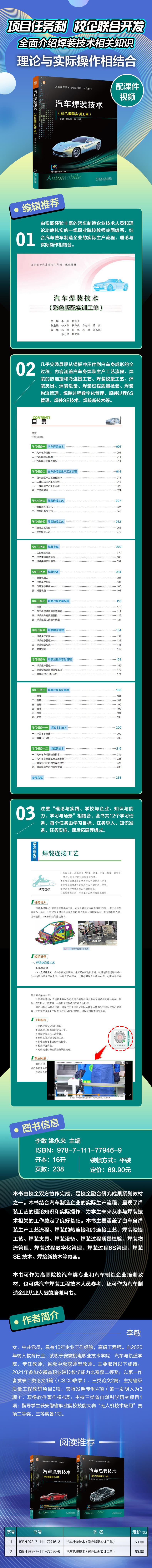 本书由校企双方协作完成,是校企融合研究成果系列教材之一。本书结合汽车制造企业的实际生产流程,呈现了焊装工艺的理论知识和实际操作,为学生未来从事与焊装技术相关的工作奠定了良好基础。本书主要涵盖了白车身焊装生产工艺流程、焊装的热连接和冷连接工艺、焊装胶接工艺、焊装夹具、焊装设备、焊装过程质量检验、焊装物流管理、焊装过程数字化管理、焊装过程6S 管理、焊装SE 技术、焊接新技术等内容。 本书可作为高职院校汽车类专业和汽车制造企业培训教材,也可供汽车焊装工程技术人员参考,还可作为汽车制造企业从业人员的培训用书。