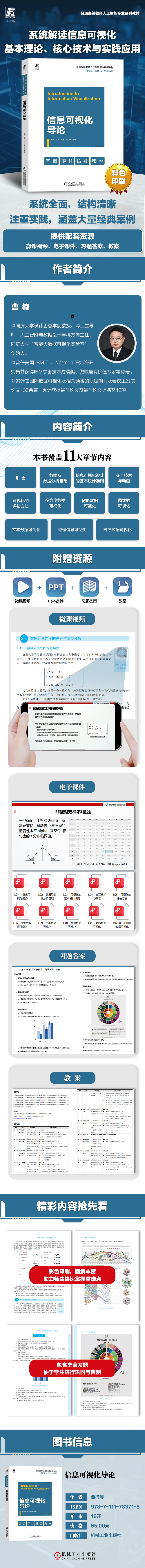 本书以信息可视化的基本理论为主线,结合可视化设计和数据处理的预备知识,系统阐述了信息可视化的核心内容与实践应用。全书共11章,分为两个部分。前5章为第一部分,主要介绍信息可视化基础知识,内容涵盖引言、数据及数据分析基础、信息可视化设计的基本设计准则、交互技术与动画以及可视化的评估方法;第6~11章为第二部分,主要介绍面向不同数据类型的可视化方案,内容涵盖多维度数据可视化、树形和图数据可视化、文本数据和地理信息可视化、时序数据可视化。 本书注重基本概念、原理和方法的介绍,弱化复杂的技术推导,适合计算机科学、数据科学及信息技术相关专业的本科生、研究生作为教材使用,同时也可供从事数据分析和信息可视化的科技人员参考。