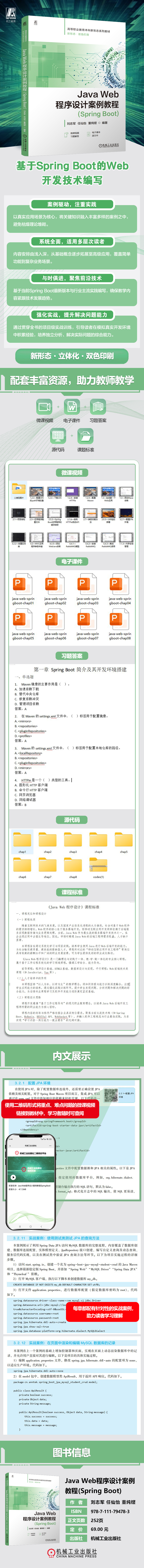 本书全面介绍了基于Spring Boot的Web开发技术,内容从入门到高级应用逐步展开。第1章聚焦基础概念及环境搭建,帮助读者快速上手。第2章深入核心功能模块,包括依赖注入、配置管理、请求映射、文件上传、应用程序的打包与部署等。第3章围绕数据库访问展开,详细解析了JPA和MyBatis的使用方法。第4章通过实例讲解Spring Boot MVC应用程序设计,使读者能够掌握Web开发核心技术。第5章探讨了RESTful接口开发、跨域设置及Swagger文档生成。第6章介绍实时通信技术,如SSE、WebSocket和RabbitMQ。第7章对比分析基于Cookie的传统会话管理与JWT无状态会话控制技术。第8章重点讲解应用安全体系,涵盖拦截器、过滤器及Spring Security的实际应用。通过学习本书,读者将全面掌握Spring Boot开发技巧,并能构建高效、安全的Web应用。 本书从易学易用的角度出发,每章都精心设计了与该章知识点相关的可实际运行的案例,方便读者边学边练。作为教材,每章末尾均附有习题,以指导读者深入思考和学习。本书既可作为职业本科、高职高专院校计算机软件技术专业课程的教材,也可以作为广大计算机爱好者的自学参考书。