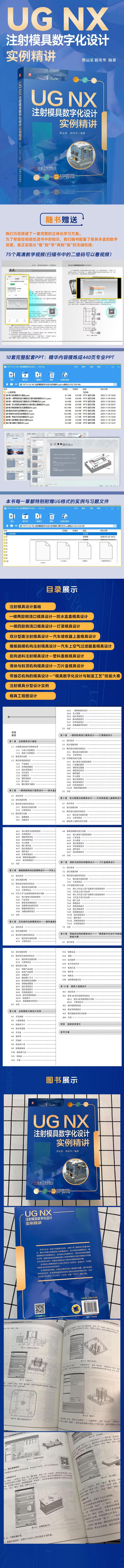 本书以企业一线生产的模具为实例,主要介绍了模具设计的基本知识,通过介绍单分型面侧浇口注射模具设计、双分型面注射模具设计、推板脱模机构注射模具设计、反向进料注射模具设计、滑块与斜顶机构模具设计等,能够使读者迅速掌握使用UG和燕秀模具外挂进行模具设计的基本方法和设计技巧,并解决在模具设计过程中所遇到的诸多问题。 本书适合从事模具相关行业的工程技术人员参考,也适合大、中专院校相关专业的学生和老师参考。 本书配有教学视频,可通过扫描对应的二维码进行观看,便于老师教学和学生自学。本书同时配套所有实例及习题涉及的零件素材文件,可关注机械工业出版社“机工电气”公众号,回复“79772”即可下载。
