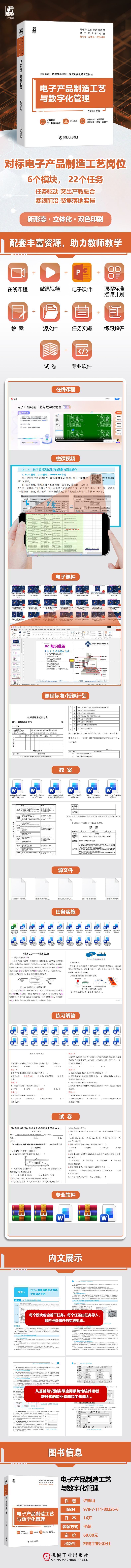 本书是为适应电子信息产业优化升级需要,对接电子信息产业数字化、网络化、智能化发展新趋势,对接新产业、新业态、新模式下电子工程技术人员岗位(群)的新要求,为满足电子信息产业高质量发展对高层次技术技能人才的需求而编写的。 本书共有6个模块:电子制造工艺基础知识,电子产品数字化生产与工艺,PCBA电路板检测与整机安全测试工艺,工艺文件与新产品导入,工艺设施维护、技术改进与创新,生产与工艺数字化管理。每个模块包含若干任务,每个任务由任务导入、知识准备和任务实施组成,从基础知识到实际应用系统地培养读者新时代的职业素养和工作能力。 本书图文并茂,结构清晰,易教、易学,可作为高职本科电子信息相关专业和高职专科电子信息工程技术、智能光电技术应用、智能产品开发与应用等专业的教材,同时适合电子产品制造行业工程技术人员参考。
